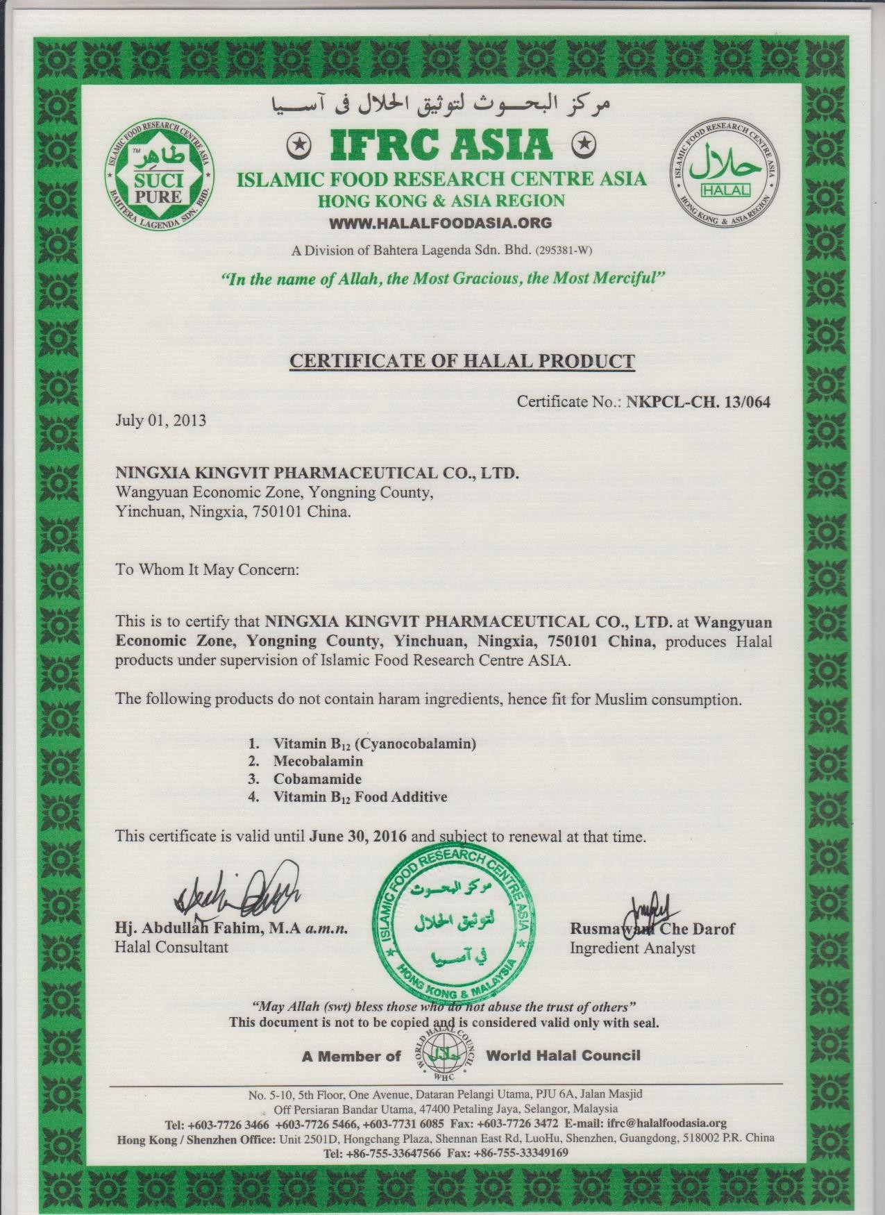 2013年08月27日,IFRC-halal認(rèn)證機(jī)構(gòu)派審核員易卜拉欣-蘭振強(qiáng)先生蒞臨我公司進(jìn)行IFRC-halal認(rèn)證的驗(yàn)廠現(xiàn)場(chǎng)檢查。按照國(guó)際清真標(biāo)準(zhǔn)的通用規(guī)則,主要對(duì)我公司的管理體系、生產(chǎn)工藝、原輔料和廠區(qū)實(shí)際情況進(jìn)行了徹底的審查。在審查過程中審核員表示我公司能夠滿足IFRC-HALAL認(rèn)證的標(biāo)準(zhǔn)要求,也能夠持續(xù)有效地實(shí)施下去,并可達(dá)到既定的目標(biāo)。